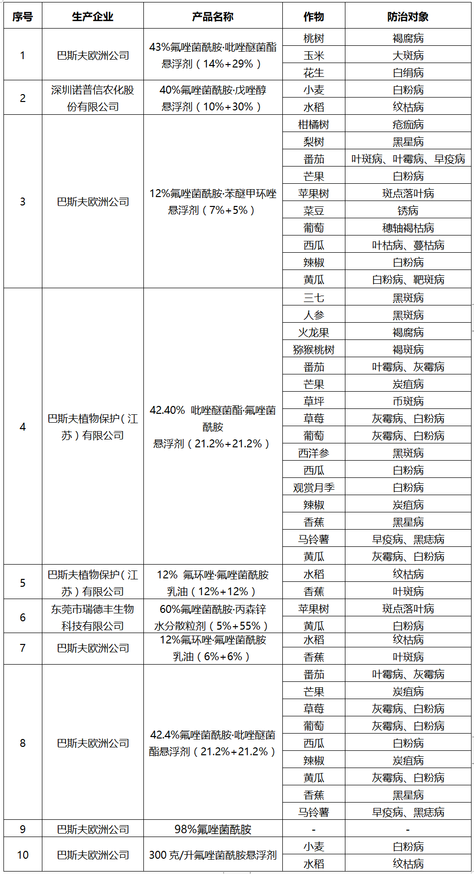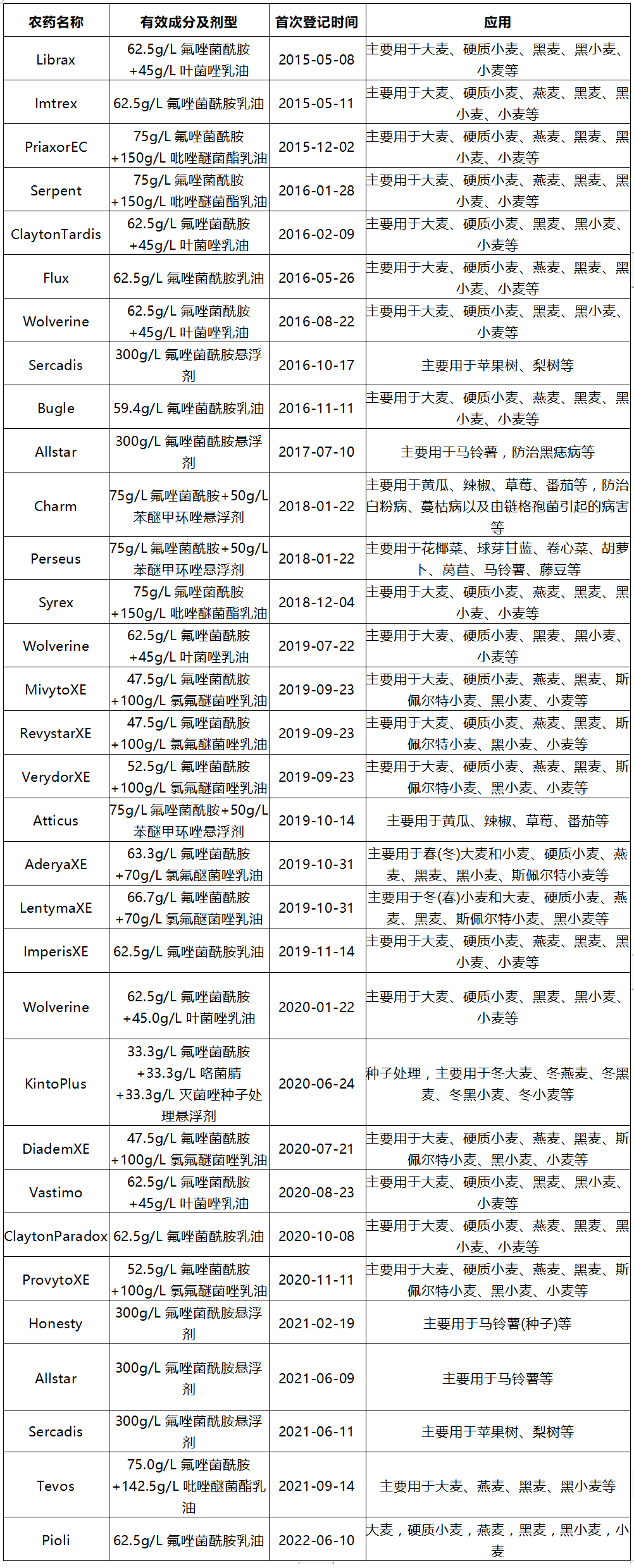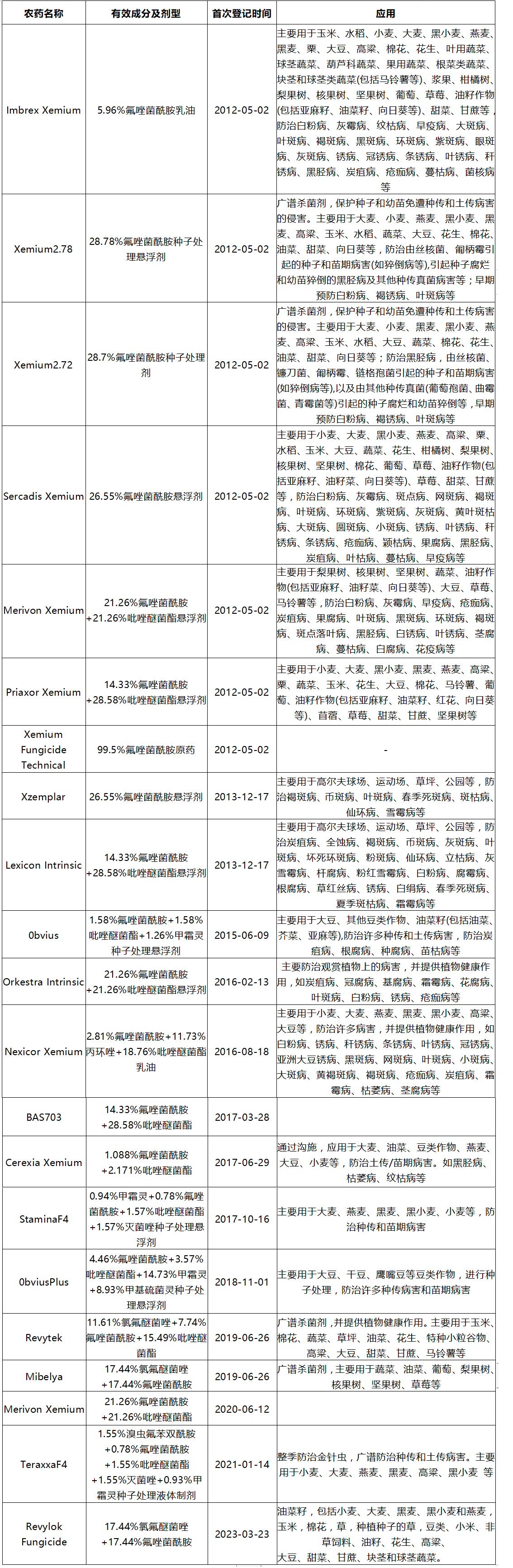 在中國巴斯夫登記了98%氟唑菌酰胺原藥。巴斯夫、諾普信、瑞德等等企業(yè)登記了共計9個制劑產(chǎn)品,包含:懸浮劑6個(單劑以及同吡唑醚菌酯、戊唑醇、苯醚甲環(huán)唑的復(fù)配制劑),乳油2個,水分散粒劑1個,具體如下:
