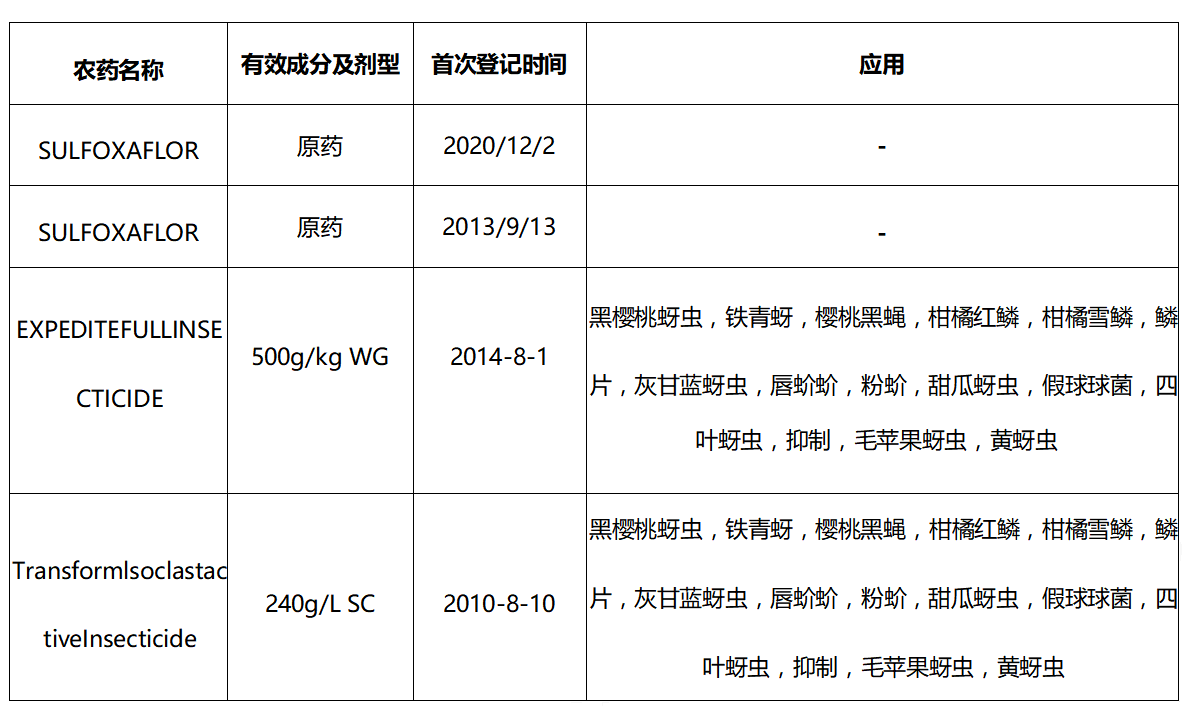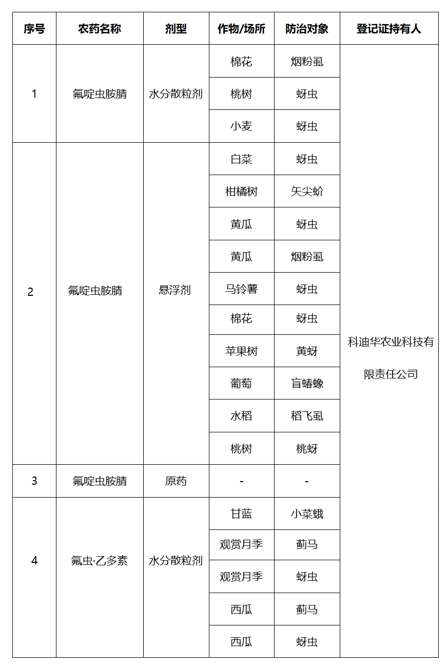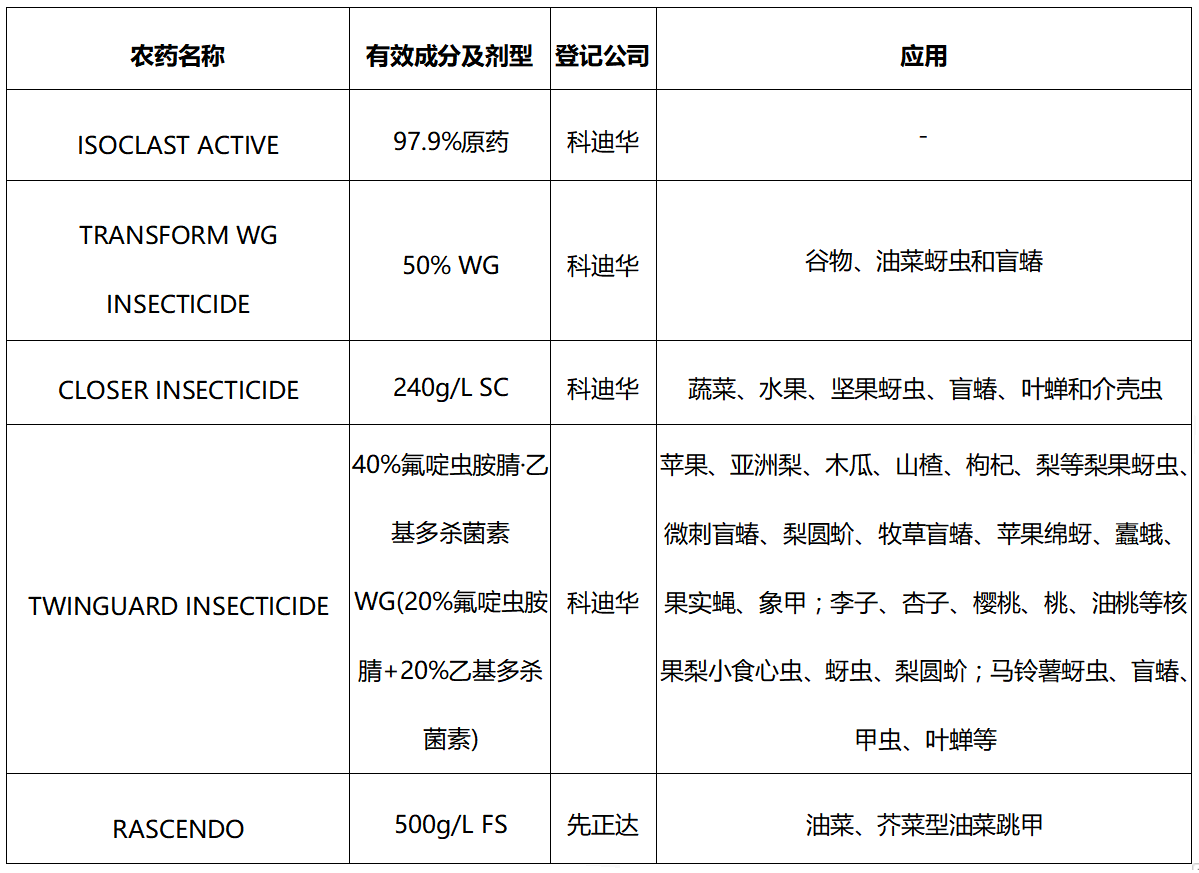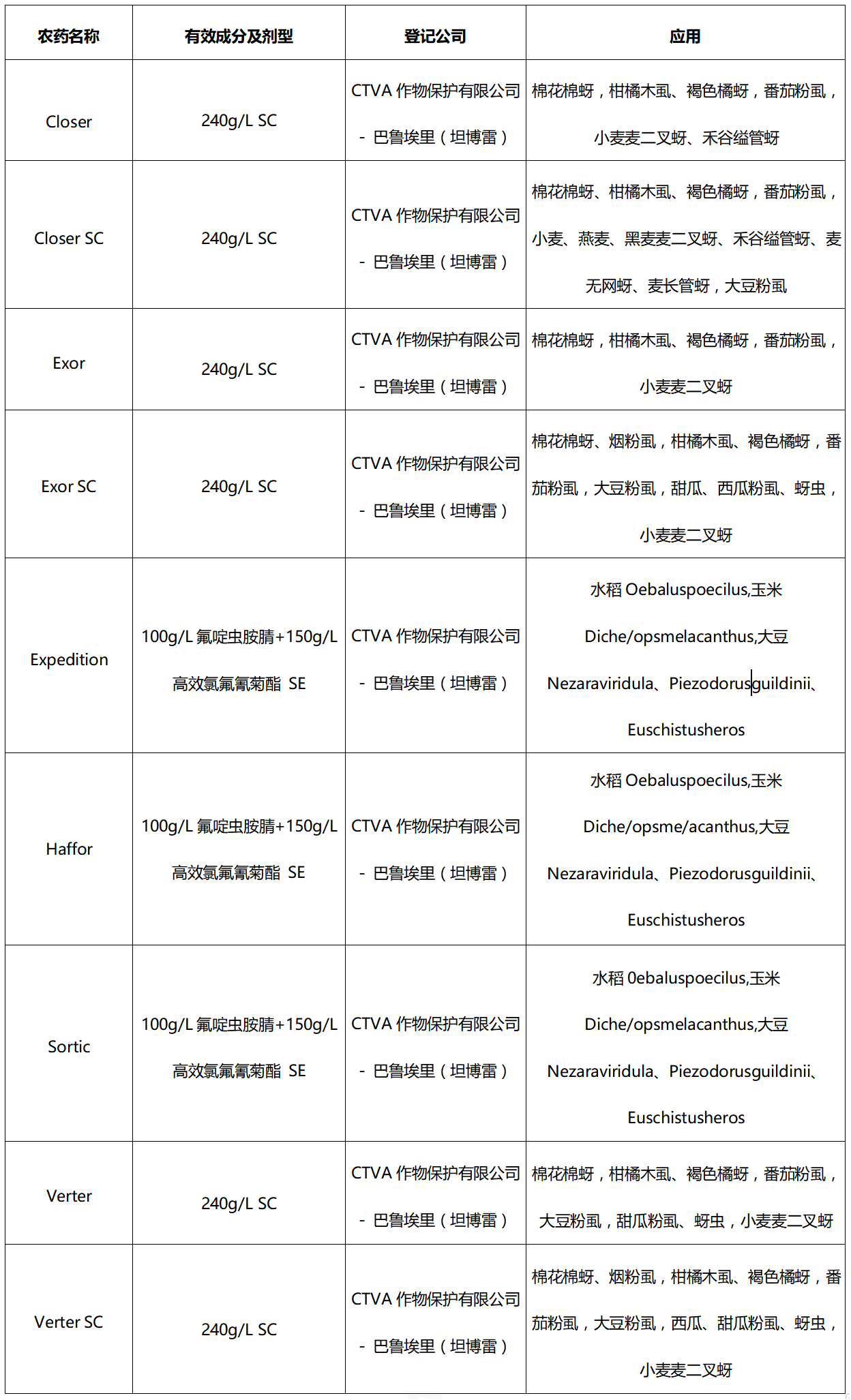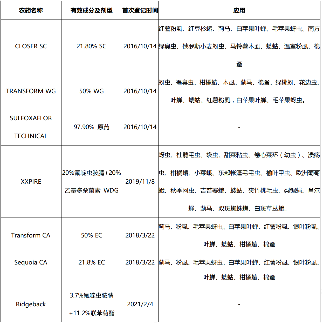 科迪華在澳大利亞登記了氟啶蟲胺腈原藥及兩款單劑產(chǎn)品,具體登記情況見下表。