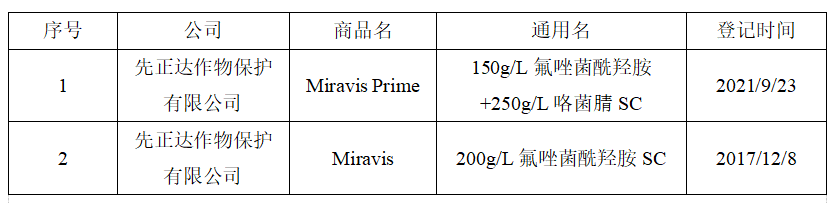 2016年11月中旬,氟唑菌酰羥胺與苯醚甲環(huán)唑的復(fù)配產(chǎn)品Miravis Duo在阿根廷獲準(zhǔn)登記。這是氟唑菌酰羥胺在全球的首個(gè)商品化登記。Miravis Duo可有效防治大豆葉斑病,對(duì)白粉病防效優(yōu)異,并能防治大豆上的一些頑固病害,如赤霉病和霉病等,這些病害能使大豆嚴(yán)重減產(chǎn)。2017年,Miravis Duo在阿根廷上市;2018年擴(kuò)作防治辣椒白粉病、番茄白粉病、灰斑病等。2018年先正達(dá)Miravis Top(氟唑菌酰羥胺+苯醚甲環(huán)唑)用于馬鈴薯、番茄等,2020年6月該產(chǎn)品在阿根廷擴(kuò)作,防治葡萄白粉病。2019年,先正達(dá)在阿根廷上市了Elatus Ace(苯并烯氟菌唑+丙環(huán)唑),用于小麥。2019年12月,先正達(dá)在阿根廷上市了Miravis Duo(氟唑菌酰羥胺+苯醚甲環(huán)唑),防治向日葵黑莖病和黑斑病等。
