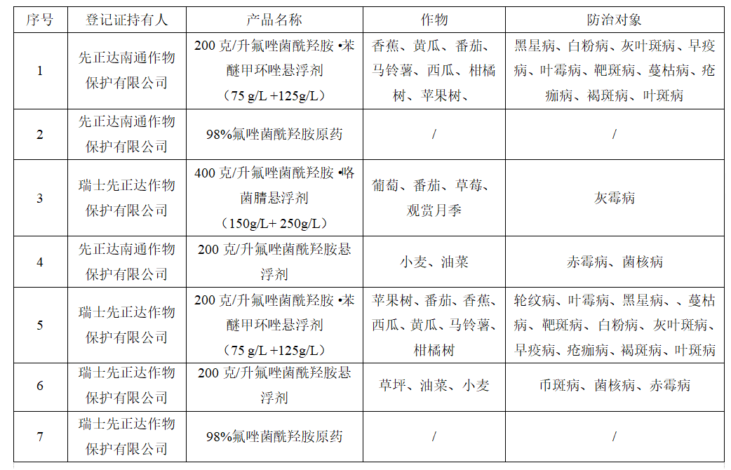 2016年,氟唑菌酰羥胺在阿根廷首獲登記,2017年在該國上市。2018年,基于氟唑菌酰羥胺的產(chǎn)品已在全球14個國家取得登記,到2019年發(fā)展到30個國家。目前氟唑菌酰羥胺已在全球50多個國家登記,用于100多種作物,防治30多種主要病害。其市場覆蓋阿根廷、烏拉圭、新西蘭、智利、美國、加拿大、韓國、澳大利亞、危地馬拉、薩爾瓦多、多明尼加共和國、贊比亞、中國、日本等國。氟唑菌酰羥胺在中國登記產(chǎn)品7個,其中原藥2個,單劑2個,復(fù)配制劑3個,復(fù)配成分包括苯醚甲環(huán)唑和咯菌腈。具體情況見下表。