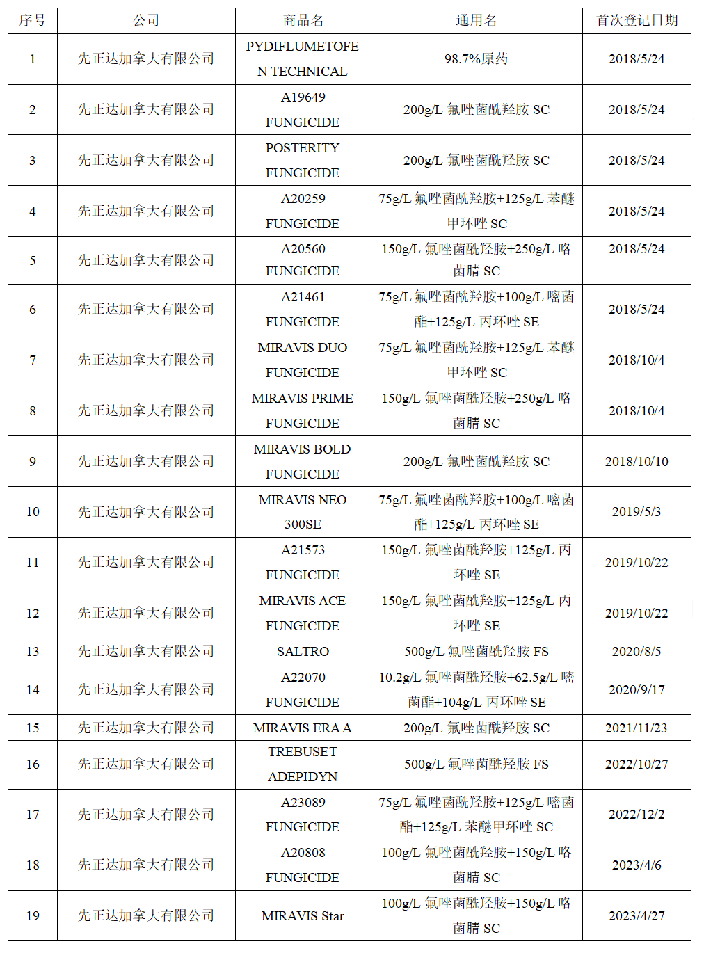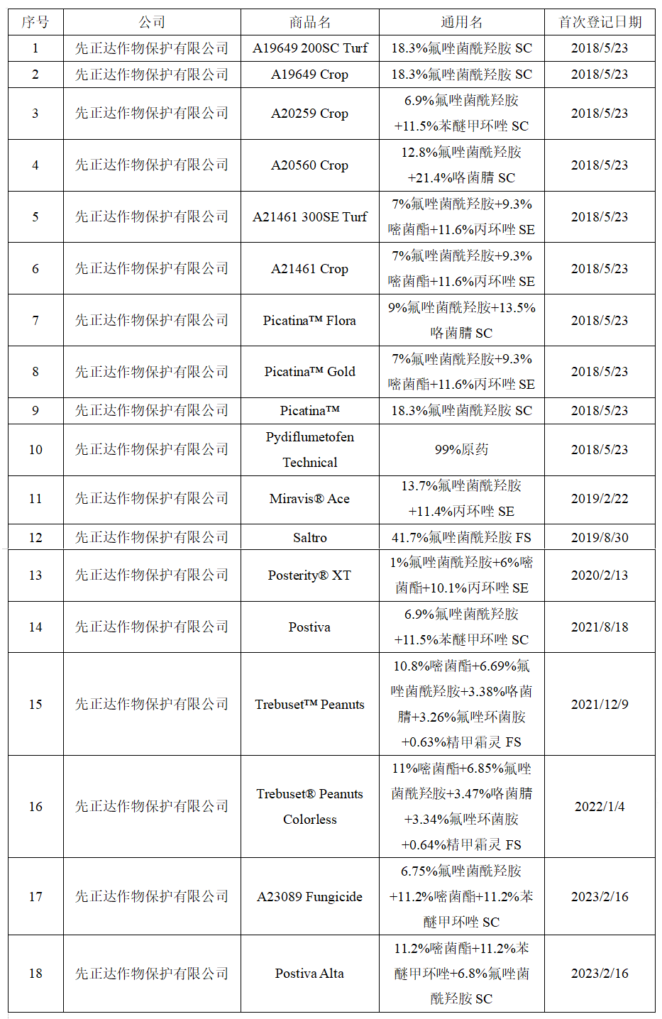 氟唑菌酰羥胺在其他國家登記情況:2016年11月中旬,氟唑菌酰羥胺與苯醚甲環(huán)唑的復(fù)配產(chǎn)品Miravis Duo在阿根廷獲準(zhǔn)登記。這是氟唑菌酰羥胺在全球的首個商品化登記。Miravis Duo可有效防治大豆葉斑病,對白粉病防效優(yōu)異,并能防治大豆上的一些頑固病害,如赤霉病和霉病等,這些病害能使大豆嚴(yán)重減產(chǎn)。2017年,Miravis Duo在阿根廷上市;2018年擴(kuò)作防治辣椒白粉病、番茄白粉病、灰斑病等。2018年先正達(dá)Miravis Top(氟唑菌酰羥胺+苯醚甲環(huán)唑)用于馬鈴薯、番茄等,2020年6月該產(chǎn)品在阿根廷擴(kuò)作,防治葡萄白粉病。2019年,先正達(dá)在阿根廷上市了Elatus Ace(苯并烯氟菌唑+丙環(huán)唑),用于小麥。2019年12月,先正達(dá)在阿根廷上市了Miravis Duo(氟唑菌酰羥胺+苯醚甲環(huán)唑),防治向日葵黑莖病和黑斑病等。